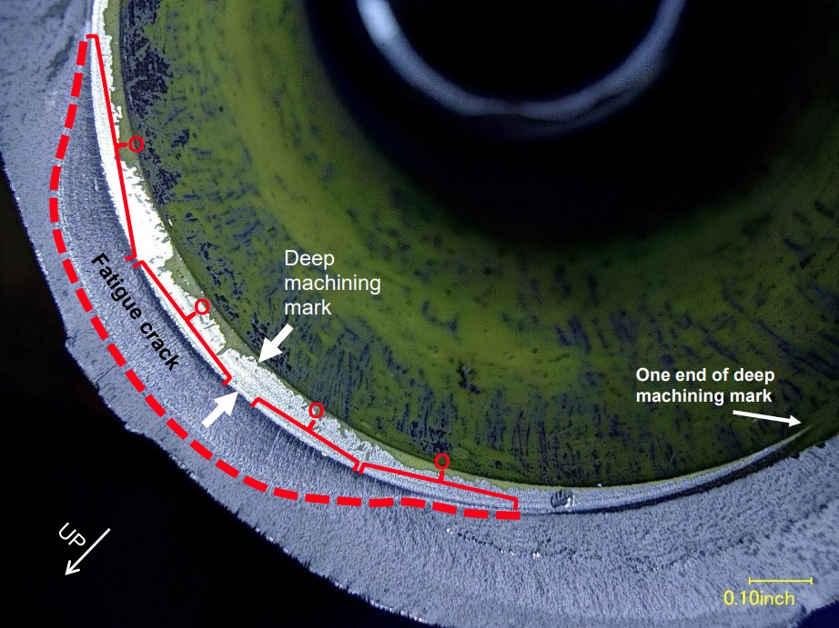 疲勞裂紋源自深加工痕跡。 NTSB,報(bào)告編號16-022。